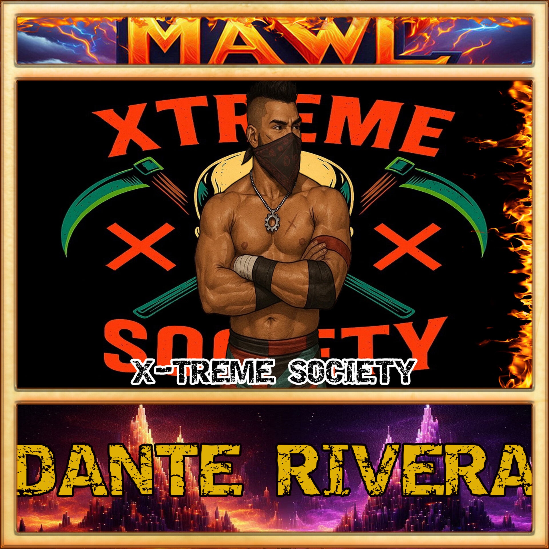 Ash: First! From Pittsburgh, Pennsylvania, weighing in at 205 pounds, one half of X-Treme Society, DANTE RIVERA!!!