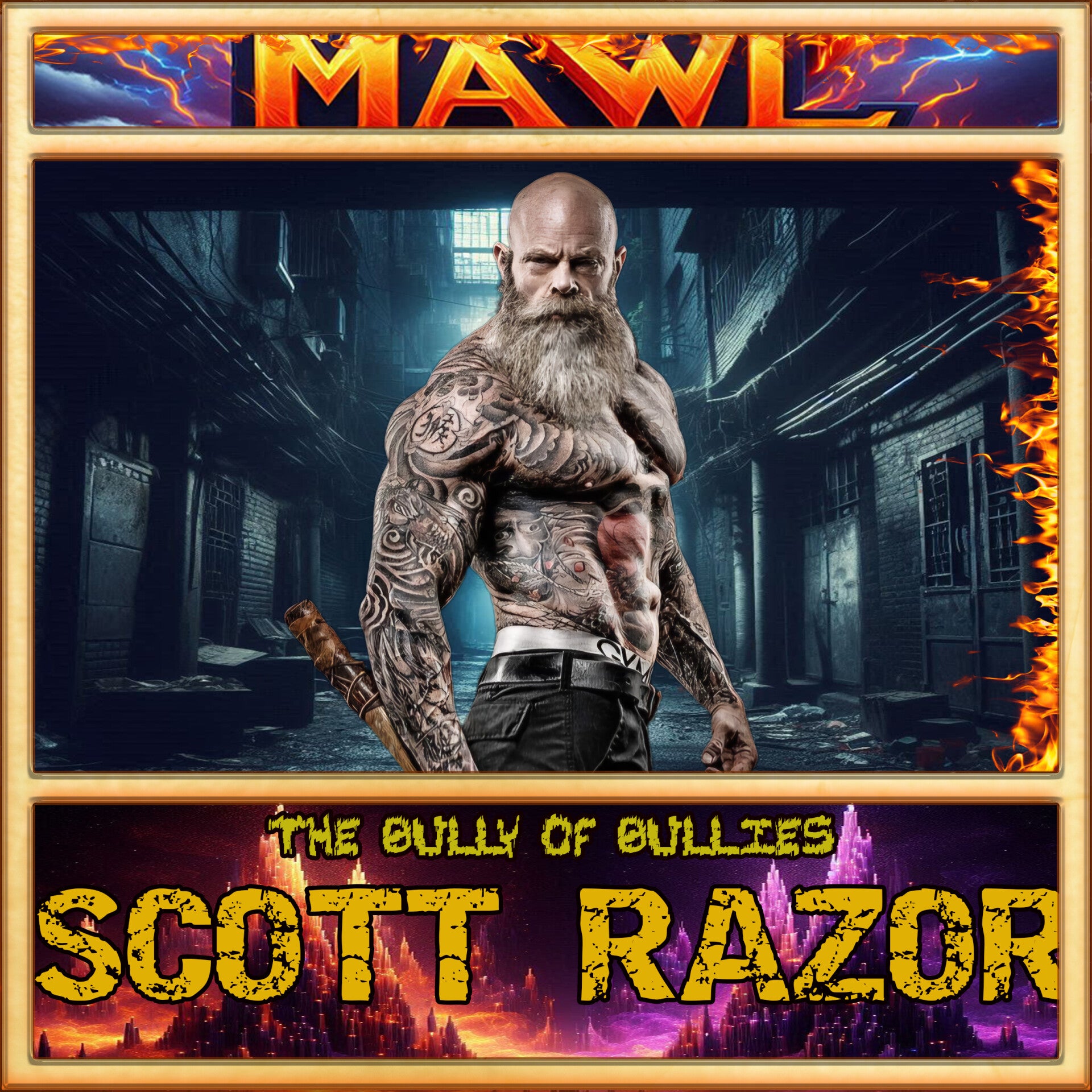 He walks down the ramp and to the ring, jumping onto the apron and climbing through the ropes. He stands in the center of the ring, slowly removing his shades from his face. He eyes fixed on the camera (or opponent). He tosses the shades to the side and stomps hard onto the mat, setting off flames on all four corners of the ring.